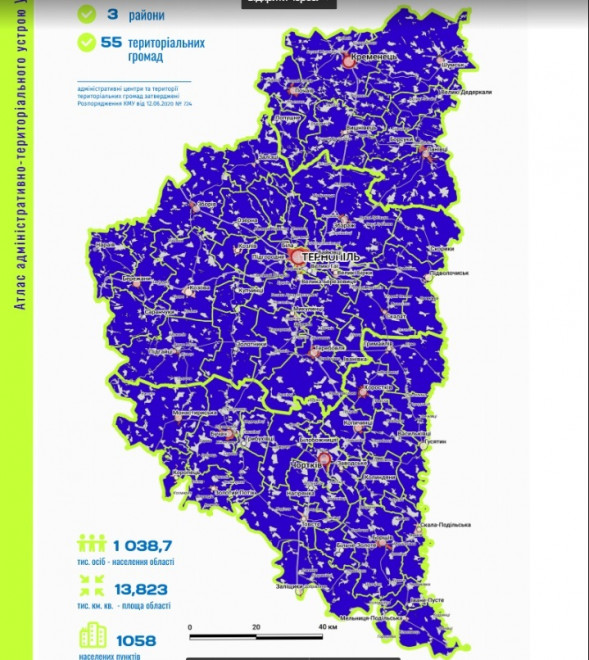 На карті позначено 1058 населених пунктів, в яких проживає 1,038,7 млн осіб. Площа області складає – 13,823 тис.км.кв. Відповідно до нових змін, на карті відображено 3 нових райони: Кременецький з чисельність 144,7 тис. осіб; Тернопільський – 567 тис. осіб, та Чортківський – 334,2 тис. осіб. Загалом на території області утворено 55 об’єднаних територіальних громад.