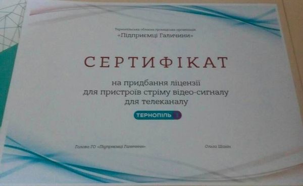 Ми, як громадська організація із активною життєвою позицію, хочемо посприяти подальшому розвитку та процвітанню цього масштабного проекту та подарувати каналу Тернополь 1 сертифікат на придбання ліцензії для пристроїв стріму відео сигналу.