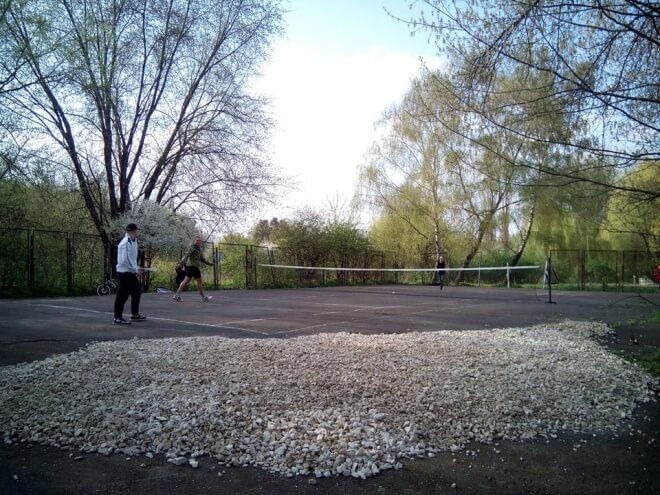 “Цього року на тенісному корті з’явилася значна заглибина через яку під час гри кілька людей травмувалося, – розповідає у соціальній мережі Oleg Synovets. – 22 березня під зустрічі з міським головою було досягнуто домовленості, щоб тенісний корт привести до мінімальної готовності перед відкриттям сезону, адже генеральна реконструкція корту може розпочатися лише за кілька місяців. По дорученню мера 11 квітня було привезене каміння для вирівнювання корту.
