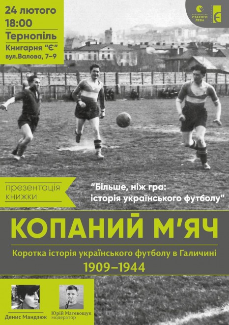 Книгарня “Є” спільно з «Видавництвом Старого Лева» запрошують на презентацію книжки «Копаний м’яч. Коротка iсторiя украïнського футболу в Галичинi 1909–1944». Захід відбудеться 24 лютого. Початок – о 18.00. Модератор — Юрій Матевощук.