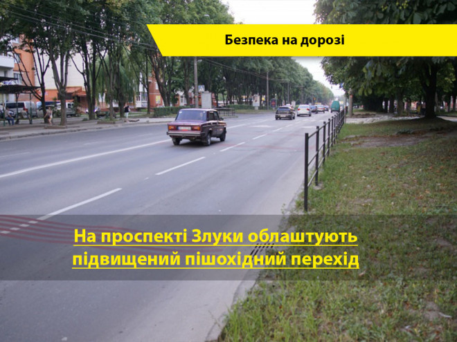 Задля попередження дорожньо-транспортних пригод за участю пішоходів та зниження швидкості автотранспорту під час руху, у Тернополі на просп. Злуки (поблизу «Універсаму) уже цього тижня розпочнуться роботи з влаштування підвищеного пішохідного переходу.
