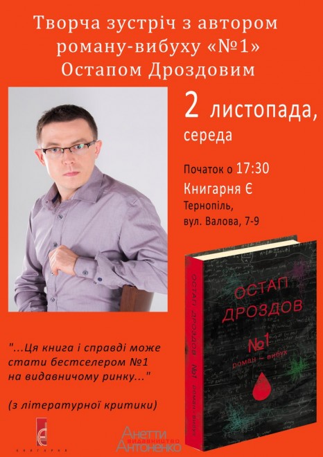 Книгарня “Є” та «Видавництво Анетти Антоненко» запрошують на презентацію книжки книжки Остапа Дроздова «№1. Роман-вибух». Захід відбудеться 2 листопада. Початок – о 17.30.