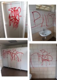 Місцеві правоохоронці за допомогою камер відеоспостереження швидко встановили осіб, які розмалювали стіни та двері вбиральні червоною фарбою. Ними виявились троє місцевих жителів віком від 19 до 25 років, які на момент “малювання” перебували в стані алкогольного сп’яніння.