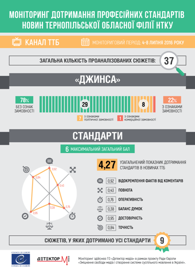 Упродовж моніторингового періоду експерти проаналізували 37 сюжетів каналу ТТБ, які вийшли в підсумкових випусках новин, із них ознаки замовності містили 8, або 22% від контенту. З них 7 – з політичною складовою, 1 – із комерційною.