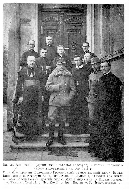 Василь Вишиваний (Архикнязь Вільгельм Габсбург) у гостині тернопільського духовенства в лютому 1918 р. о. крилані. Володимир Громницький, тернопільський парох, Василь Вишиваний, о. Ксаверій Бонн, ЧНІ, сотн. М. Луцький, ад’ютант архикнязя, о. Тома Бородайкевич; другий ряд: о. Мих. Гайдукевич, о. Василь Кузьма, о. Тимотей Сембай, о. Лев Кочій, о. Іван Пасіка, о. Р. Присташевський.