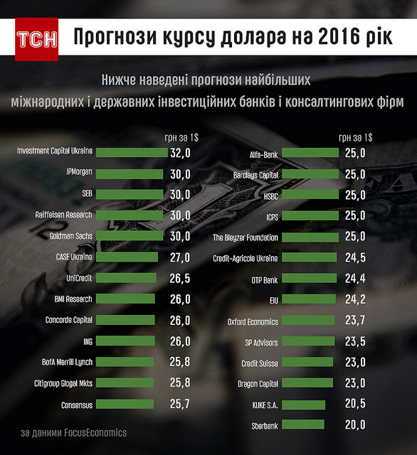Середній курс долара в 2016 році може становити близько 26 гривень Курс долара в Україні в 2016 році становитиме 25,7 гривні. Такі середні дані випливають із прогнозних показників провідних міжнародних та українських фінансових, інвестиційних, консалтингових компаній та банків.Консенсус-прогноз склала організація Focus Economics. Компанія займається складанням економічного аналізу та прогнозів для 127 країн в Африці, Азії, Америці та Європі, пише Insider.
