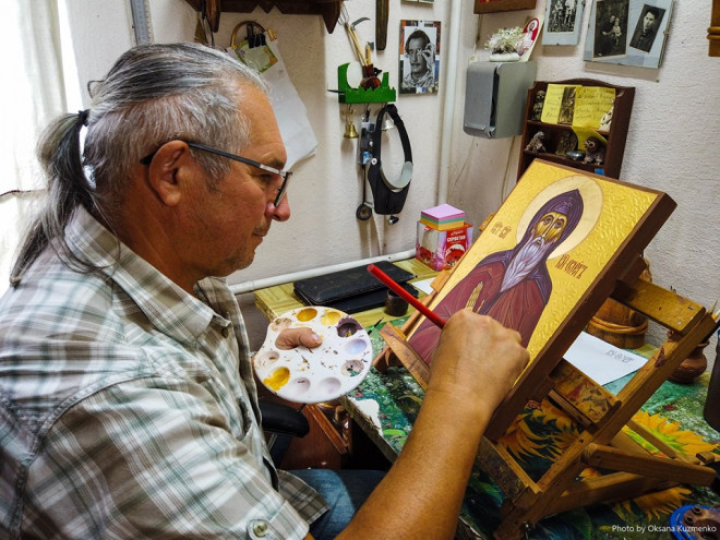 – Володимир пише ікони у візантійському стилі, тому всі лиця святих сумні і мають видовжену форму;