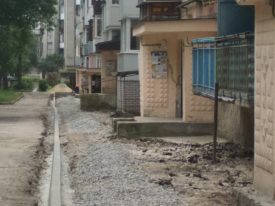 Тут вже здійснили роботи із розбирання асфальтобетонного покриття тротуару та демонтажу бордюрів, а також приступилидо влаштування щебеневої основи тротуару та відмостки.