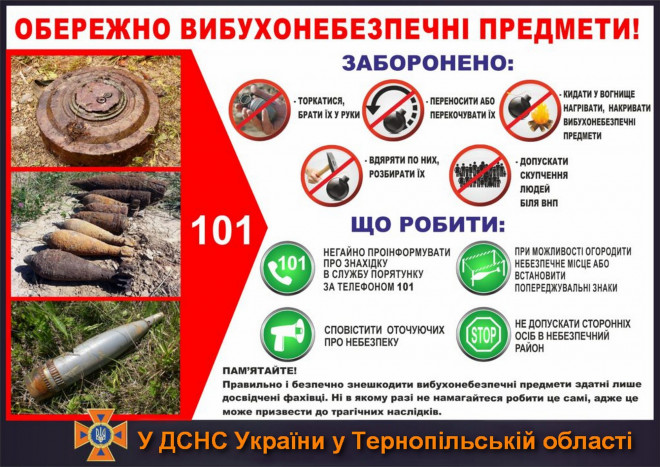 - повідомити про знахідку службу порятунку за номером «101». Повідомлення робити не поспішаючи, чітко, із зазначенням точної адреси (орієнтирів) місця знаходження вибухонебезпечного предмета);