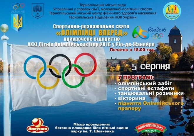 Сьогодні, 5 серпня о 18.00 в парку ім.Т.Г. Шевченка (бетонна площадка біля літньої сцени) відбудеться спортивно-розважальне свято «ОЛІМПІЙЦІ ВПЕРЕД», приурочене відкриттю XXXI літніх Олімпійських ігор 2016 у Ріо-де-Женейро.