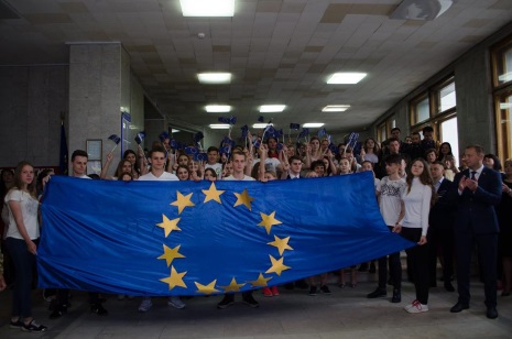 «Це дуже важлива подія, щоб ще раз заявити: ми – Європа! А тому, піднімаючи прапор Європейського Союзу, потрібно, щоб всі за ним «піднялися» до європейських цінностей. Адже саме на доброчесності, любові, повазі один до одного будується європейське співтовариство, і ми повинні побудувати Європу в наших душах і виховати в собі європейську сутність. І саме освіта – це та галузь, яка повинна вирішити цю ключову для нас проблему. Бо якщо ми виховаємо молодь у європейських цінностях, матимемо велике майбутнє!», – наголосив під час урочистостей Перший заступник міністра освіти й науки України Володимир Ковтунець.