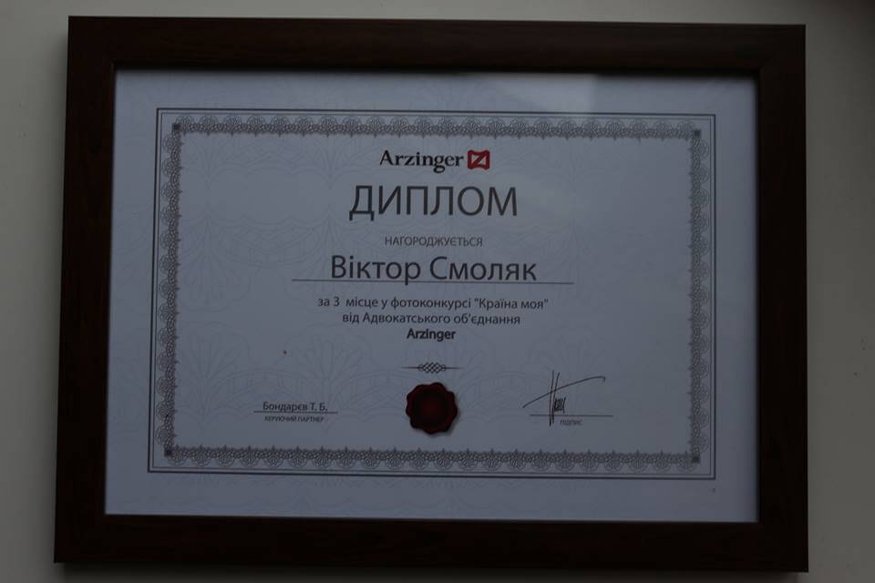 12 лютого відбулося урочисте привітання на заході присвяченому річниці Arzinger. Кожному переможцю було надано диплом та видання КРАЇНА. МОЯ. 2015 з фотографіями переможців. Віктор Смоляк був єдиним фотографом з Тернопільщини, серед тих, хто брав участь у проекті.