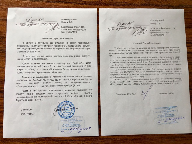 У документах йдеться про те, що перевізники вимагають у мера підняти вартість проїзду в маршрутках готівкою – до 6 грн, електронним квитком – до 5,50 грн, і «Картою тернополянина» – до 5 грн. Різні перевізники «одною мовою» наголошують на зменшенні власних прибутків через запровадження електронної системі оплати. Тобто вони протестують проти чіткого обліку перевезень в громадському транспорті у Тернополі. Адже тепер вводиться чіткий обліг пільговиків та реального використання ними громадського транспорту. Бо головним аргументом перевізників у спілкуванні з місцевим самоврядуванням, коли йдеться про потребу підвищення тарифів, є «велика кількість пільговиків». Тепер буде точно відомо, скільки людей з пільгами скористалися транспортом і скільки це коштує насправді.