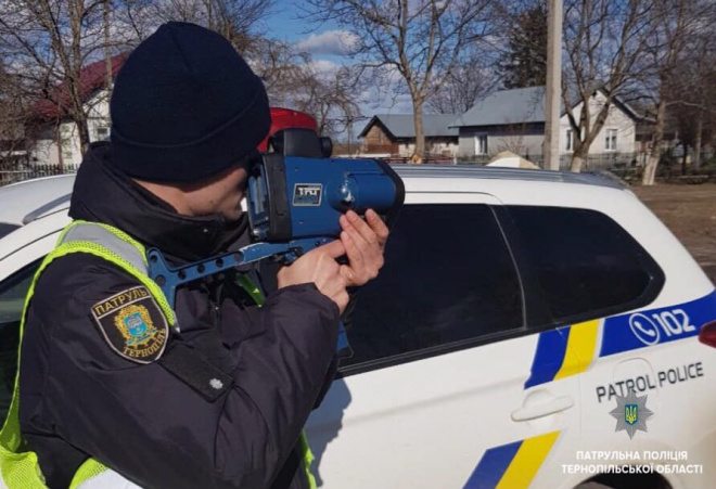 Патрульні Тернопільщини ?фіксують швидкість руху автотранспорту за допомогою лазерного приладу TruCAM на автомобільних дорогах державного значення, а саме:
