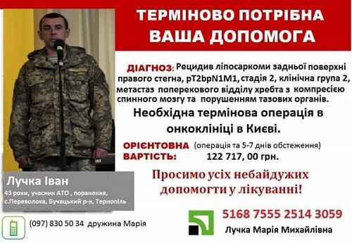– Критичний стан у нашого побратима Лучки Івана Богдановича – заступника голови спілки учасників АТО Бучацького району. Необхідне його перевезення зі Львова до Києва для проведення термінової операції в онкоклініці, – пише Yaroslav Pasternak на сторінці спілки.