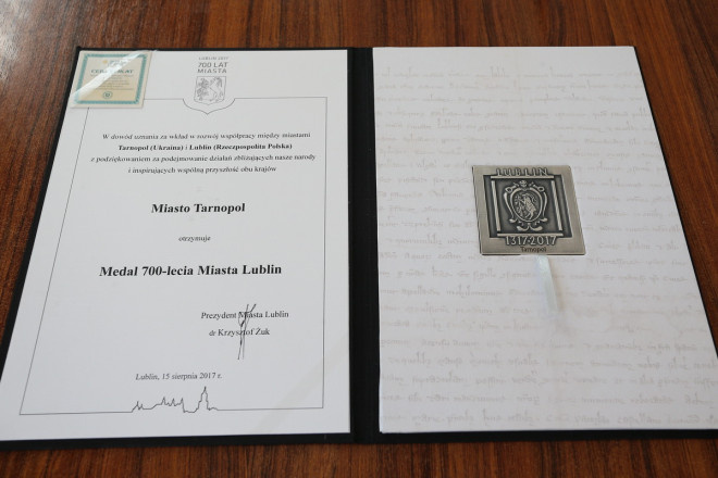 Тернопіль отримав медаль до 700-річчя міста Люблін (Польща). Відповідний документ підписано Президентом міста Люблін Криштофом Жуком. Як ідеться у документі, медаль вручена за вклад Тернополя у співпрацю між містами.