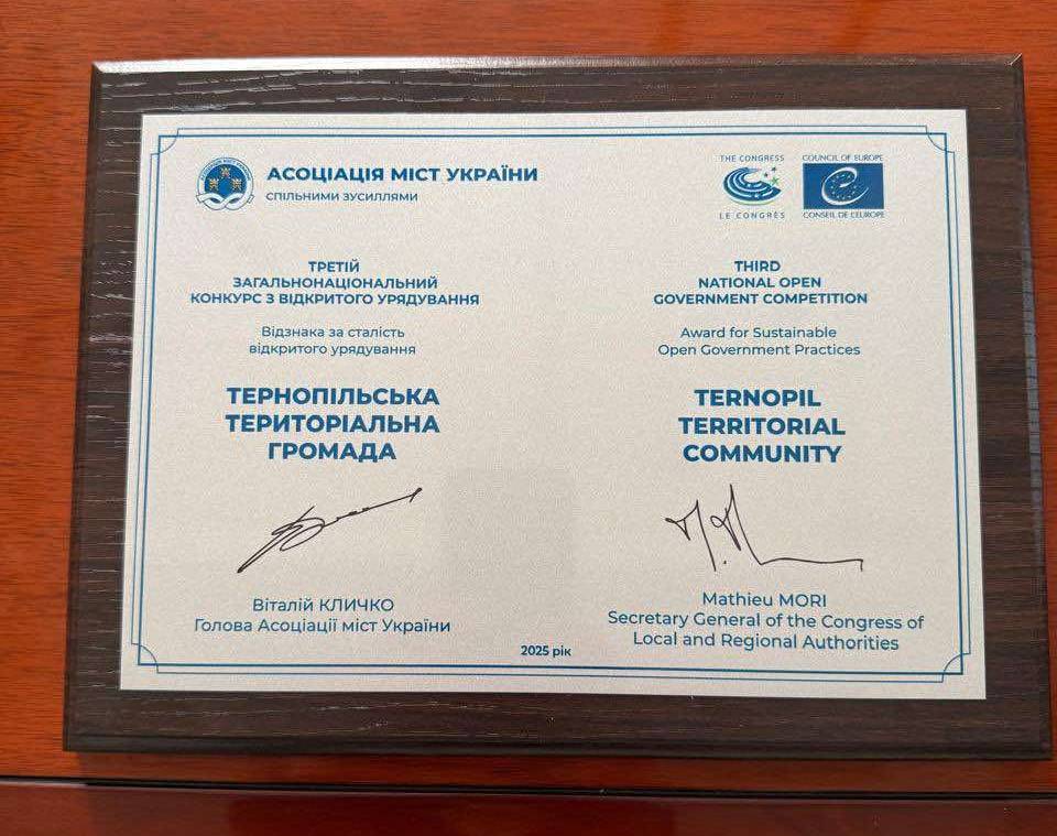 Тернопільська міська територіальна громада отримала особливу відзнаку «За сталість відкритого урядування» у Третьому загальнонаціональному конкурсі «Найкращі історії стійкості та взаємодії громад у часи війни». Нагородження відбулося 4 червня у Києві.