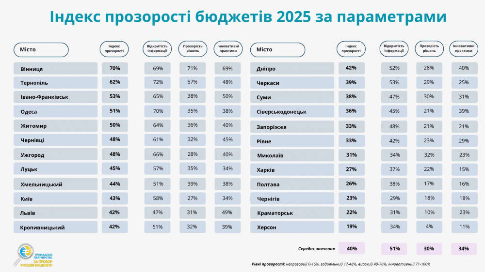 Тернопіль посів друге місце серед обласних центрів України у рейтингу прозорості бюджетів за 2025 рік. За підсумками дослідження Громадського партнерства “За прозорі місцеві бюджети!” індекс прозорості бюджету Тернополя склав 62%, що значно перевищує середньоукраїнський показник.