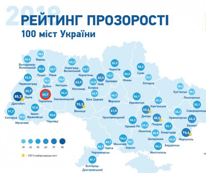 Transparency International Ukraine у Тернопільській міській раді презентувала рейтинг прозорості міст. За результатами 2018 року Тернопіль посів 10-те місце.