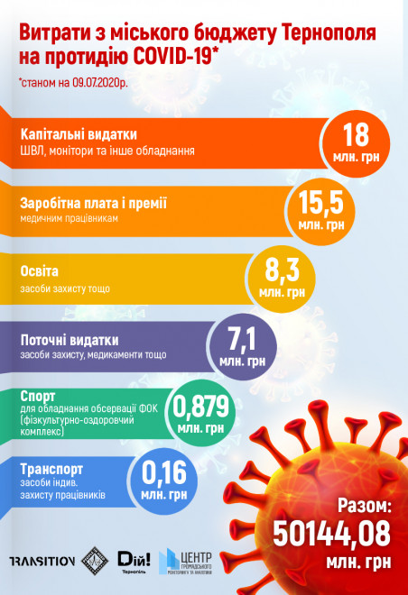 Загалом втрати бюджету Тернопільської громади у зв’язку пандемією коронавірусу за І півріччя 2020 року орієнтовно становили 90,0 млн грн або 10,9 % від запланованих власних доходів.