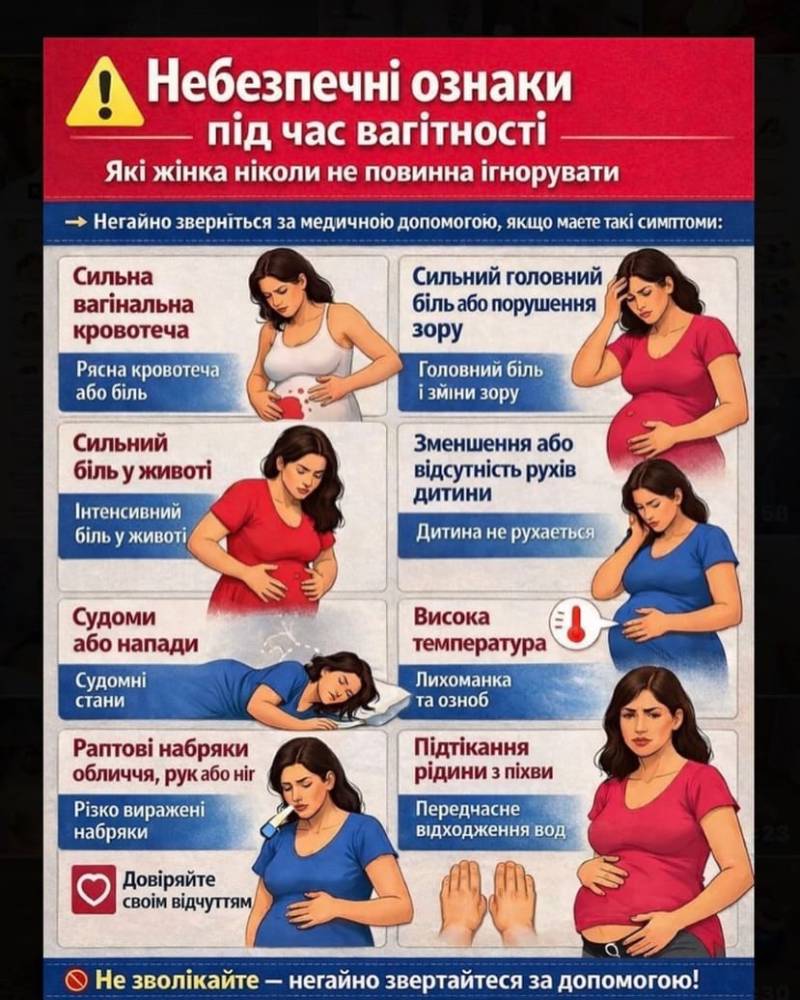 Успішний перебіг вагітності залежить не лише від фаховості медиків, а й від уважності самої жінки до власних відчуттів. Лікарка Тернопільського обласного клінічного перинатального центру «Мати і дитина» Тетяна Небесьо звернулася до майбутніх матусь із важливим нагадуванням про симптоми, які вимагають негайної медичної допомоги.