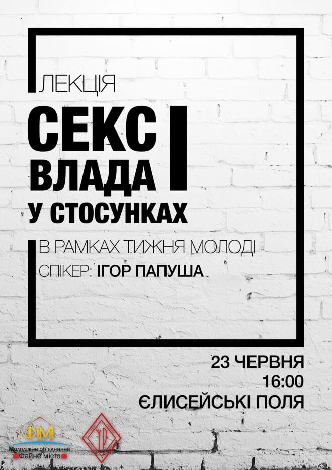 Тернопільський вуличний університет презентує нову лекцію із назвою “Секс і влада у стосунках”. Відбудеться вона 23 червня о 16.00 год. на “Єлісях”. Готує лекцію молодіжна організація “Файне місто”, а модератором виступить коуч Ігор Папуша.