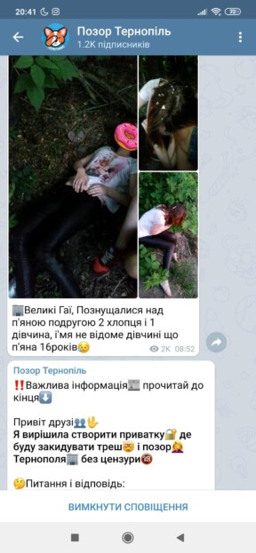 «Позор Тернополя» – саме так називається анонімний чат у «Телеграм-каналі» та «Інстаграмі». На сторінці каналу адміністратор виставляє фото провокаційного характеру з інформацією про жертву, яка зображена на ньому. Суть цієї «гри» у тому, аби спіймати свого товариша на чомусь непристойному. А допомогти в цьому може випитий алкоголь. Під одним із постів зустрічаємо слова: «Надія О. 15 років, Тернопільська область, буха в хлам» або інше: «Розвів малишку на секс. Район центр, малій 17 років». На фото чітко зображено оголене тіло дівчинки, яку без тями тягнуть до ванної кімнати парубки. Адміністратор групи називає себе Соня Вітенко. На вигляд дівчині приблизно 18 років. За найбільш провокаційні фото вона обіцяє виставляти особисті інтимного характеру. В цьому анонімному чаті понад мільйон підписників. За вступ туди дівчині на банківську картку слід перерахувати 45 грн. Після цього вона приймає ваш запит і ви маєте повний доступ до фото та відеоматеріалів.