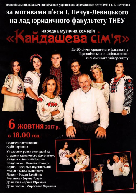 запрошують усіх на музичну комедію (за мотивами п’єси І. Нечуя-Левицького на лад юридичного факультету ТНЕУ) «Кайдашева сім’я».