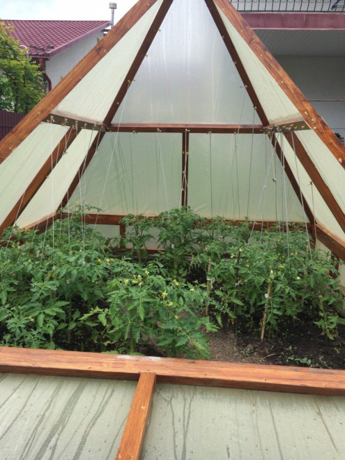 Запропоновані конструкції пірамідальної теплиці можуть бути як стаціонарного, так і переносного типу. При виборі геометричних параметрів пірамідальних теплиць варто зберігати співвідношення розмірів єгипетських пірамід, найбільшою з яких є піраміда Хеопса. Через це вони мають високі енергетичні властивості, що сприяють інтенсивному проходженню біологічних процесів у живій природі. Необхідно відзначити, що орієнтація граней пірамідної теплиці повинна відповідати сторонам світу, оскільки незначні зміни її орієнтації нівелюють позитивний ефект. Дана пірамідальна теплиця з розкладними гранями виготовлена без застосування металевих деталей, використання яких не попускається.