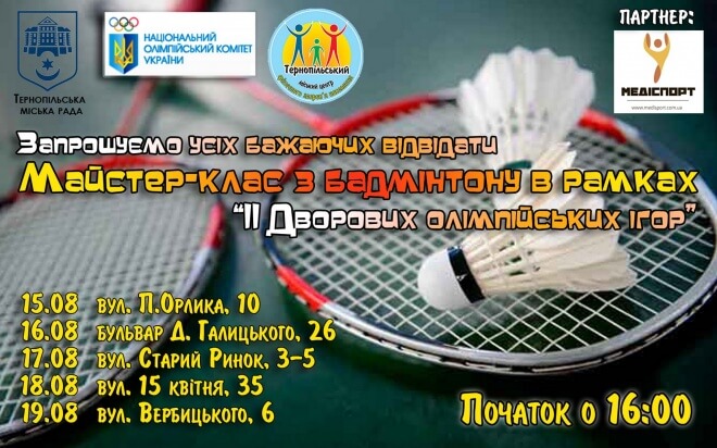 Тернопільський міський центр фізичного здоров`я населення ініціює проведення II Дворових Олімпійських ігор серед підлітків 1999-2001 р.н. на універсальних спортивних майданчиках міста Тернополя.