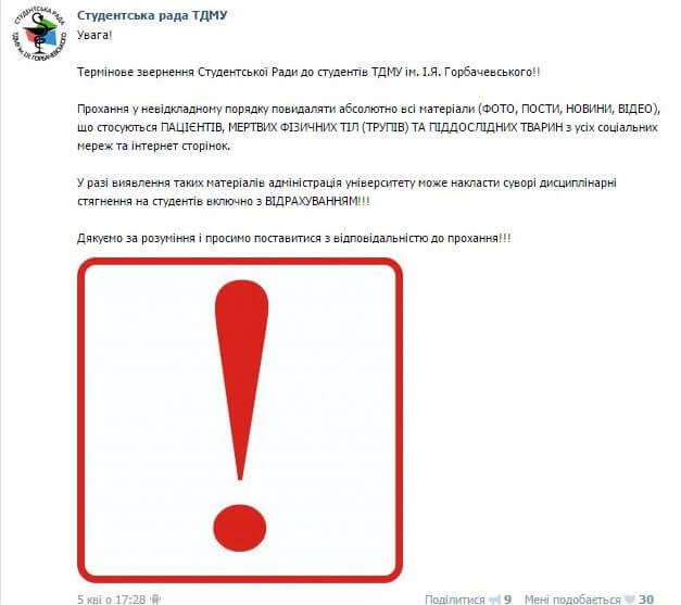 Студенти медичного університету Тернополя терміново видаляють фото, новини, відео із мертвими трупами та піддослідними тваринами. У іншому випадку їх можуть виключити із університету.