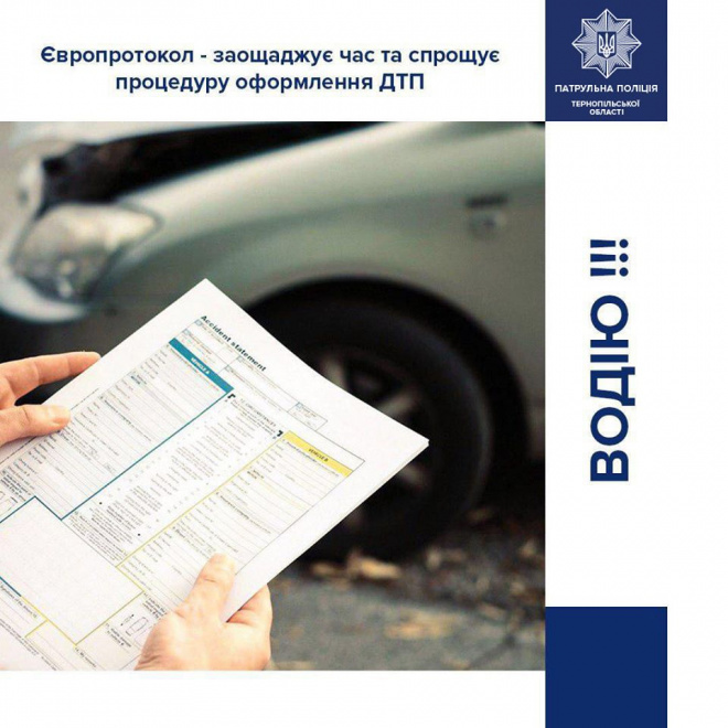 Патрульна поліція Тернопільської області, нагадує усіх водіям, що для швидкого оформлення ДТП, можна використовувати “Європротокол”.
