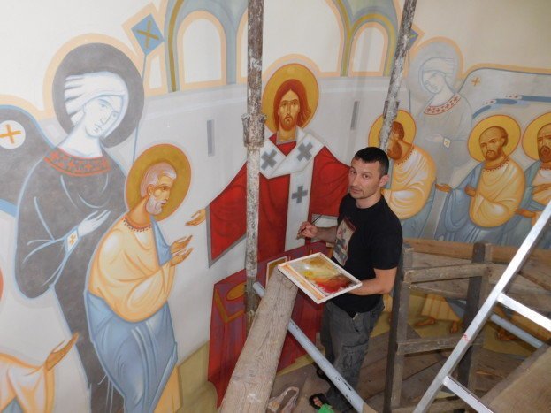 – Ми розписуємо місце, яке призначене у церкві для священників – святилище. Основний богословський стержень – історія нашого спасіння через боговтілення. Тому ми взяли три важливі іконографічні сцени. З лівої сторони в нас буде зображено вхід Христа до Єрусалиму, у центрі – ікона Євхаристії і в правій частині – розп’яття Христове. Христос – великий Архієрей, який роздає апостолам хліб і вино. Апостоли будуть із двох боків. Чому Євхаристії, а не Тайної вечері? Тому що Євхаристія – це подяка, вона несе в собі постійний зв’язок із Божественною літургією, яка відбувається у храмі. І власне ікона Євхаристії поєднує в собі і небесну, і земну літургії. Ми будемо робити Христа, як великого Архієрея, у ризах, які в собі поєднують і царські, і священичі ознаки. В Івана Богослова ми читаємо: “Цар царів, володар володарів”. Тобто Христос зображається, як цар слави, позаду йому прислуговують ангели. Це якраз і є символ того, що Євхаристія зараз відбувається на небесній літургії. А коли священик стоїть біля престолу – це земна літургія.