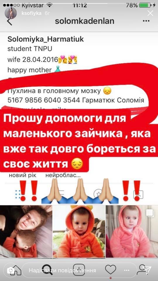 У малесенької дівчинки злоякісна прогресуюча пухлина головного мозку правої півкулі. Має пройти два курси хімії і дві пересадки кістного мозку.