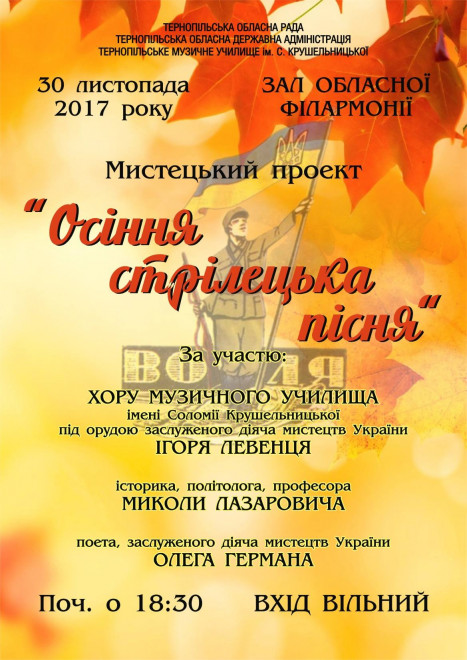 30 листопада о 18:30 год. в залі Тернопільської обласної філармонії відбудеться мистецький проект «Осіння стрілецька пісня», присвячений 103 річниці Січового Стрілецтва та 75-річчю створення УПА.