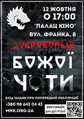 До дня Захисника України та свята Покрови Пресвятої Богородиці усі охочі зможуть переглянути фільм “Добровольці Божої чоти” в Палаці Кіно, зустрітись з людьми, які є учасниками подій фільму та отримати книги у подарунок.