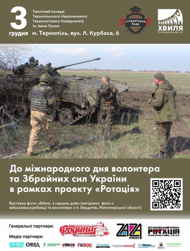 3 грудня Громадська спілка «Громадянський рух «Хвиля» та студентська рада Технічного коледжу Тернопільського Національного Технічного Університету ім. Івана Пулюя у рамках всеукраїнського проекту «Ротація», а також з нагоди міжнародного Дня волонтера та Збройних Сил України презентуватиме фото-підбірку «Війна: з перших днів».