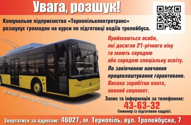 КП «Тернопільелектротранс» знаходиться за адресою: 46027, м. Тернопіль, вул. Тролейбусна, 7. Записатися на курси можна за номером 43-63-32, резюме надсилати на електронну адресу:ternotet01@meta.ua .