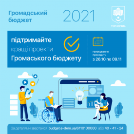 Голосування за проєкти «Громадського бюджету 2021» триватиме включно до 9 листопада. Варто зазначити, що уже більше 20 тисяч тернополян віддали свої голоси за ідеї, які підтримують. Ознайомитися з проєктами, які беруть участь у голосуванні можна за посиланням.