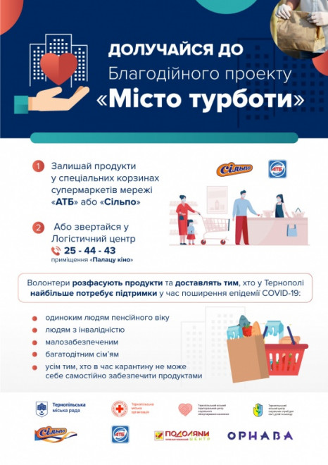 У Тернополі діє благодійний проект «Місто турботи». Основним завданням проекту є надання допомоги потребуючим, які через епідемію не можуть забезпечити себе необхідними продуктами харчування.