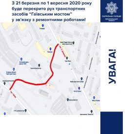 З 21 березня, у зв’язку із виконанням чергового етапу капітального ремонту шляхопроводу через залізничну колію на вул. Об’їзна, в районі вул. Гайової (“Гаївський міст”), буде повністю перекрито рух транспорту.