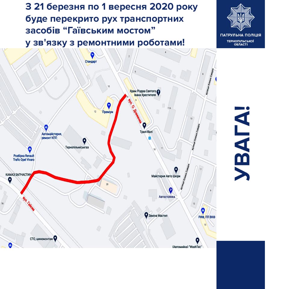 У період з 21 березня по 1 вересня 2020 року у м. Тернополі буде перекрито рух транспортних засобів “Гаївським мостом” у зв’язку із ремонтними роботами