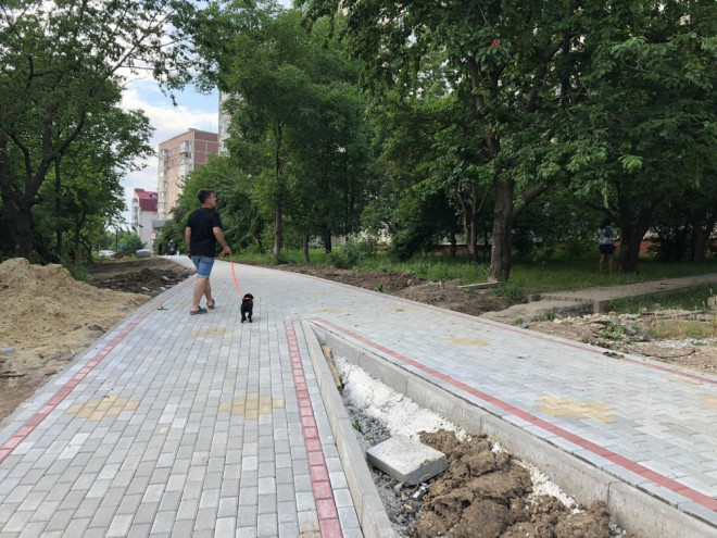 «Продовжуємо капітальний ремонт тротуару та пішохідних зон поблизу житлових будинків за адресою вул. В. Великого, 6-12. Пішохідну ділянку, довжиною 318 м, від зупинки громадського транспорту до супермаркету «АТБ», буде влаштовано фігурними елементами мощення. У визначених місцях встановлять тактильну плитку. Крім ремонту тротуару тут буде облаштовано два сходових марші та пандус», — розповів очільник міста.