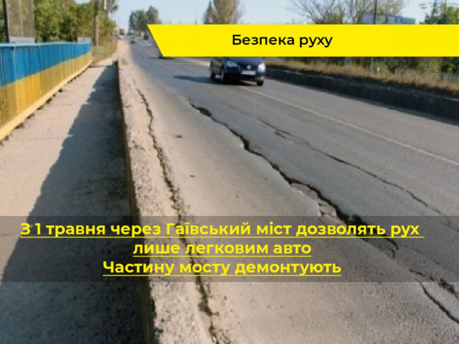 З 2016 року Гаївський міст визнано аварійним і з того часу там обмежено рух транспортних засобів вагою понад 8 тонн. Проте такої вказівки не дотримувалося чимало водіїв. Тому, щоб заборонити курсування великовагового транспорту, при в’їзді та виїзді з мосту встановлять висотні конструкції для обмеження руху та додаткові камери відеоспостереження.