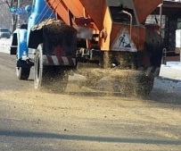 Працівники підрядних організацій здійснюють вибіркове посипання спеціальними сумішами небезпечних ділянок дороги.