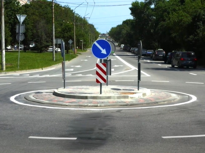 Довідка. Кругове перехрестя — це перехрестя, де транспортні засоби уповільнюються і починають круговий рух навколо центрального «острова» у напрямку проти годинникової стрілки на дорогах з правостороннім рухом або за годинниковою стрілкою на дорогах з лівостороннім рухом, до виїзду на одному з поворотів (відгалужень) з кругового перехрестя.