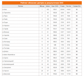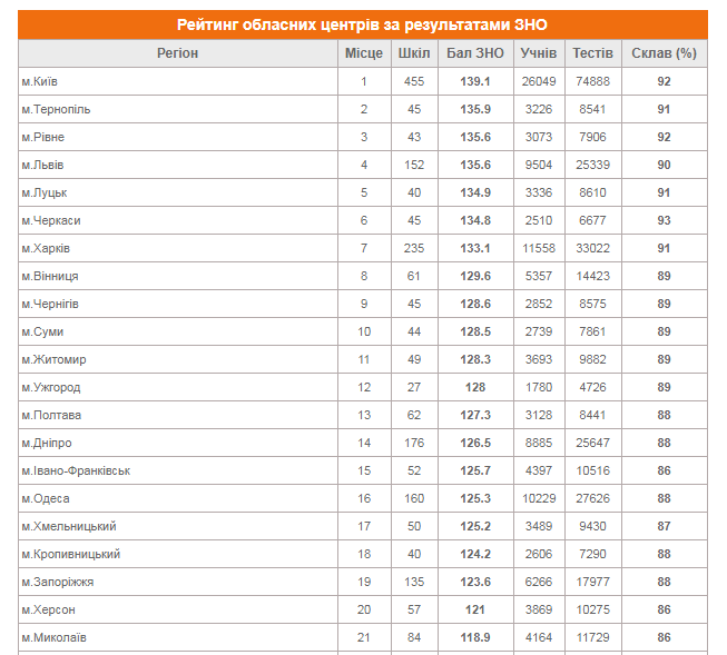 Обласні центри у таблиці ранжовані за рейтинговим балом, який розрахований на підставі середнього значення балів зовнішнього незалежного оцінювання отриманих випускниками шкіл кожного обласного центру у 2019 році.
