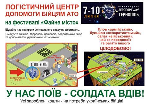 Смакуйте свіжою, здоровою, дешевою, солдатською їжею на Фестиваль ФАЙНЕ МІСТО 2016, 7 -10 липня та допомагайте українським захисникам. Адже усі кошти, виручені з продажу волонтерської їжі, будуть спрямовані на потреби військовослужбовців, що обороняють кордони України на сході держави.