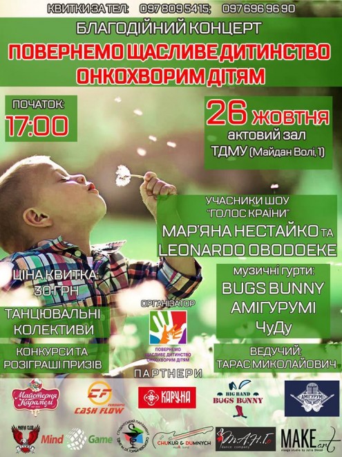 26 жовтня в стінах ТДМУ волонтери проекту “Повернемо щасливе дитинство онкохворим дітям” організовують благодійний концерт з метою збору коштів задля закупівлі медикаментів та виробів медичного призначення маленьким пацієнтам гематологічного відділення Тернопільської міської дитячої лікарні.