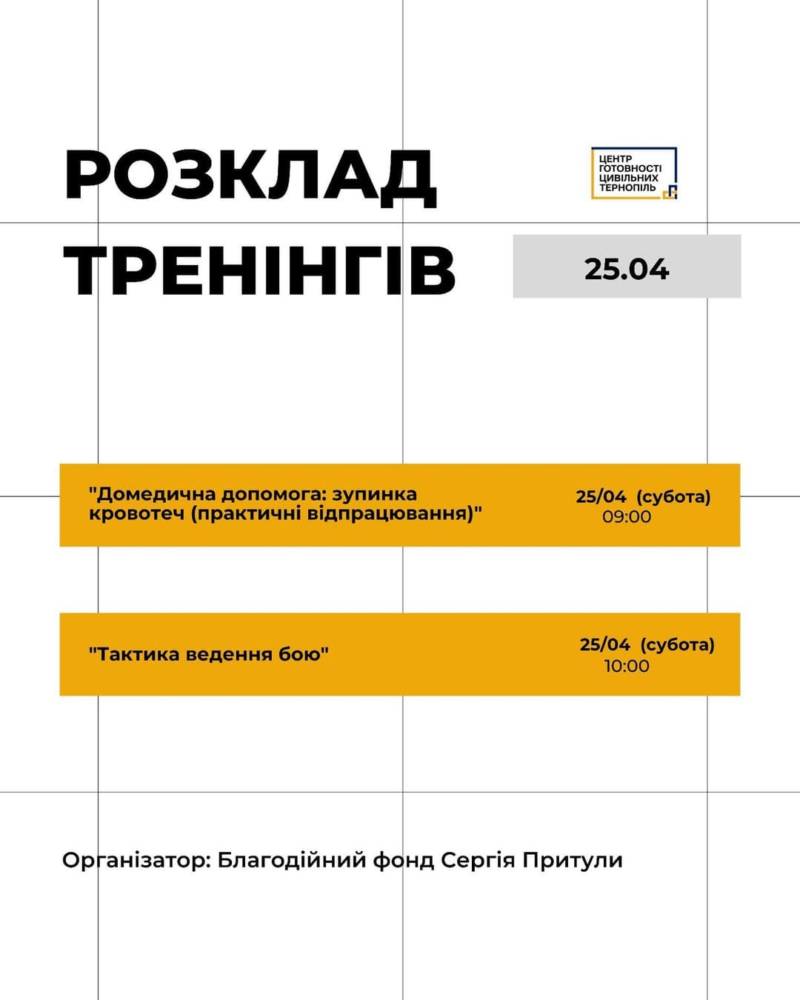 У Тернопіль цієї суботи, 25 квітня, відбудуться одразу два навчання для цивільних. Про це повідомили у тернопільському Центрі готовності цивільних. Організатори підготували практичні заняття, які можуть бути корисними як у повсякденному житті, так і в умовах війни.